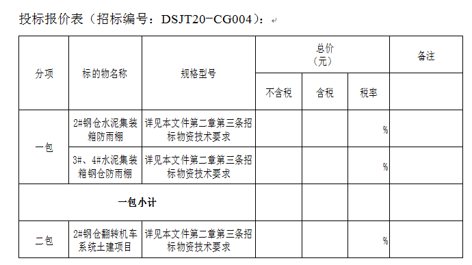 1.根據(jù)已收到貴方招標(biāo)編號為DSJT2020-CG004的大連水泥集團有限公司水泥集裝箱防雨棚(或翻轉(zhuǎn)機車系統(tǒng)土建項目)招標(biāo)文件,遵照《中華人民共和國招標(biāo)投標(biāo)法》等有關(guān)規(guī)定,我單位經(jīng)考察和研究上述招標(biāo)文件的投標(biāo)須知、約定條款、技術(shù)規(guī)范及其他有關(guān)文件后,我方愿投標(biāo)報價(詳見報價一覽表)。